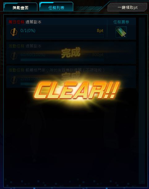 -達成獲得最終獎勵所需的pt時,將顯示 [CLEAR] 訊息,無須再進行任務