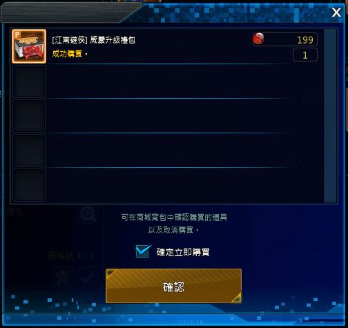 在該視窗點擊確認鍵後,商品將不會移動至商城背包,而是進行立即購買確認。